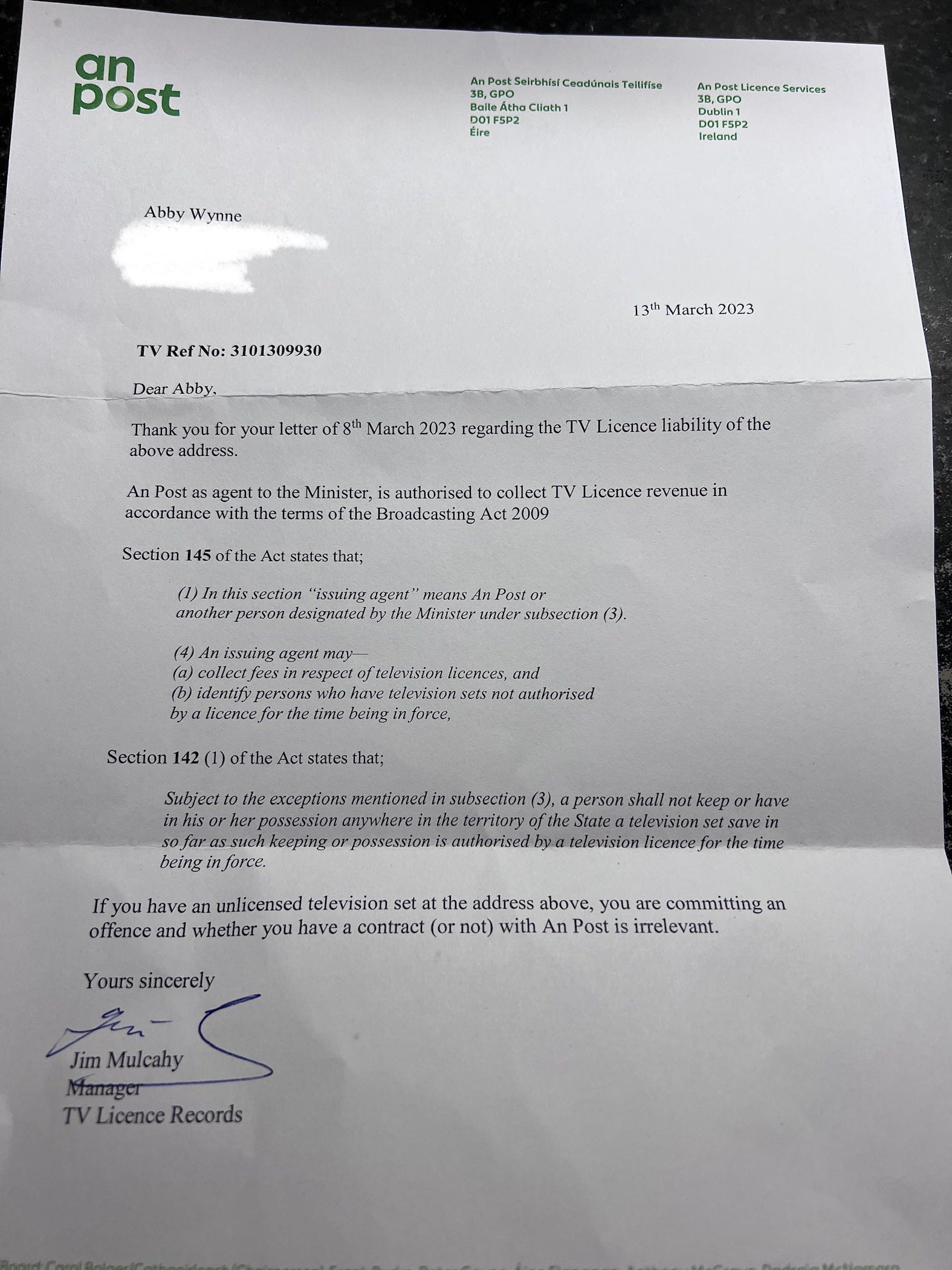 We also received a letter from An Post addressed to my Husband dated 7th March 2023 stating that “A TV Licence Inspector visited your premises recently and found you in possession of an unlicensed Television Set.” This is untrue, as the TV Licence Inspector was not invited inside our home, nor did he ask for entry, therefore this statement is erroneous.