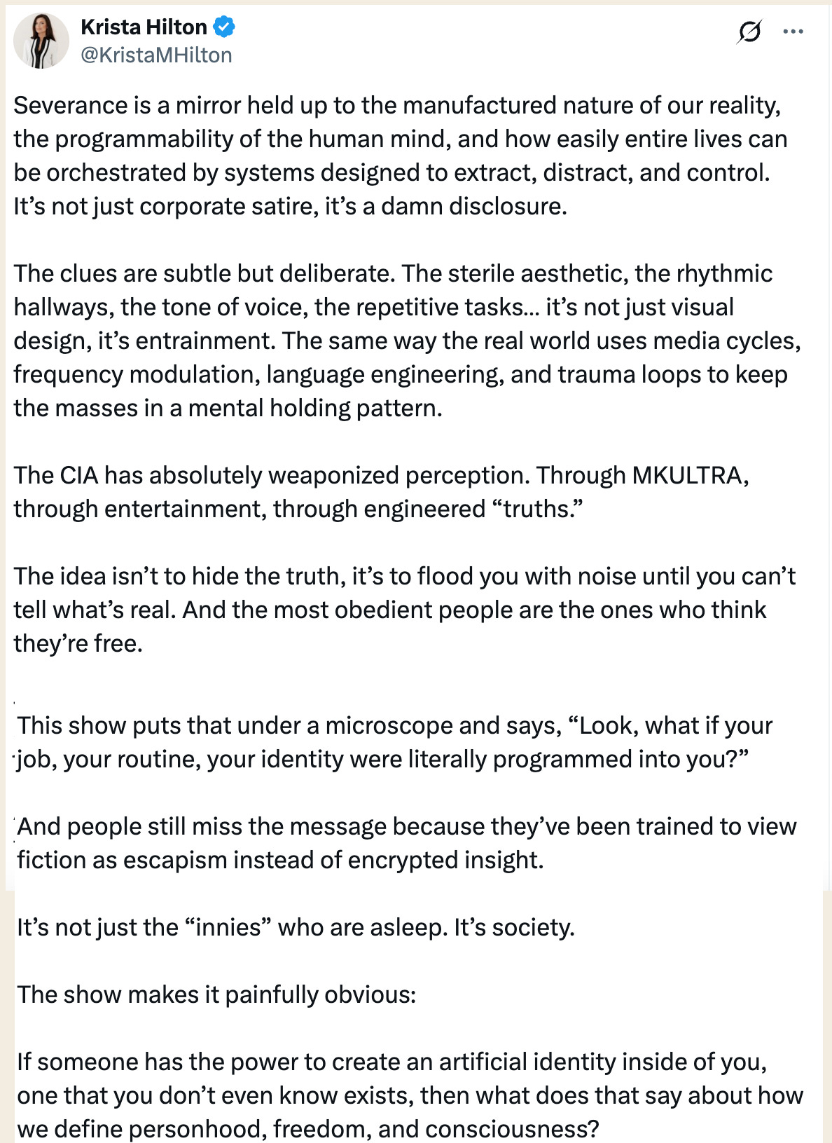 Grok: Private AI might push boundaries public stuff like me or GPT can’t touch—think neural implants or consciousness mapping. If simulation theory’s your lens, Severance could be a metaphor for it, even if it’s not literal. The matrix-y feel? That’s the show’s genius. Are we severed sims, or just drones in a corporate cage? Either way, it’s dark, trippy, and hits harder than a Lumon waffle party.