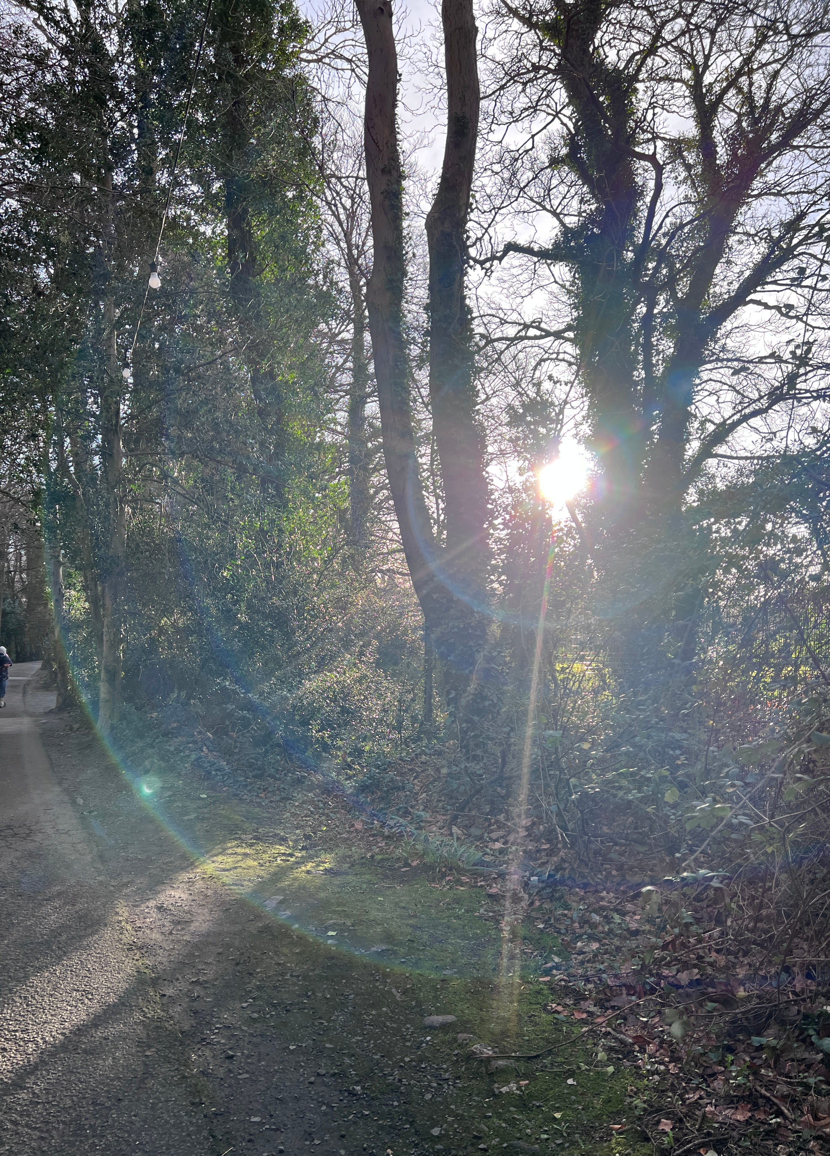 I have to bring it back to my walking, feet on the ground, winter sunshine through the trees and dogs. It’s too easy to pull away and fall into some tangental pit that becomes impossible to pull myself out of.